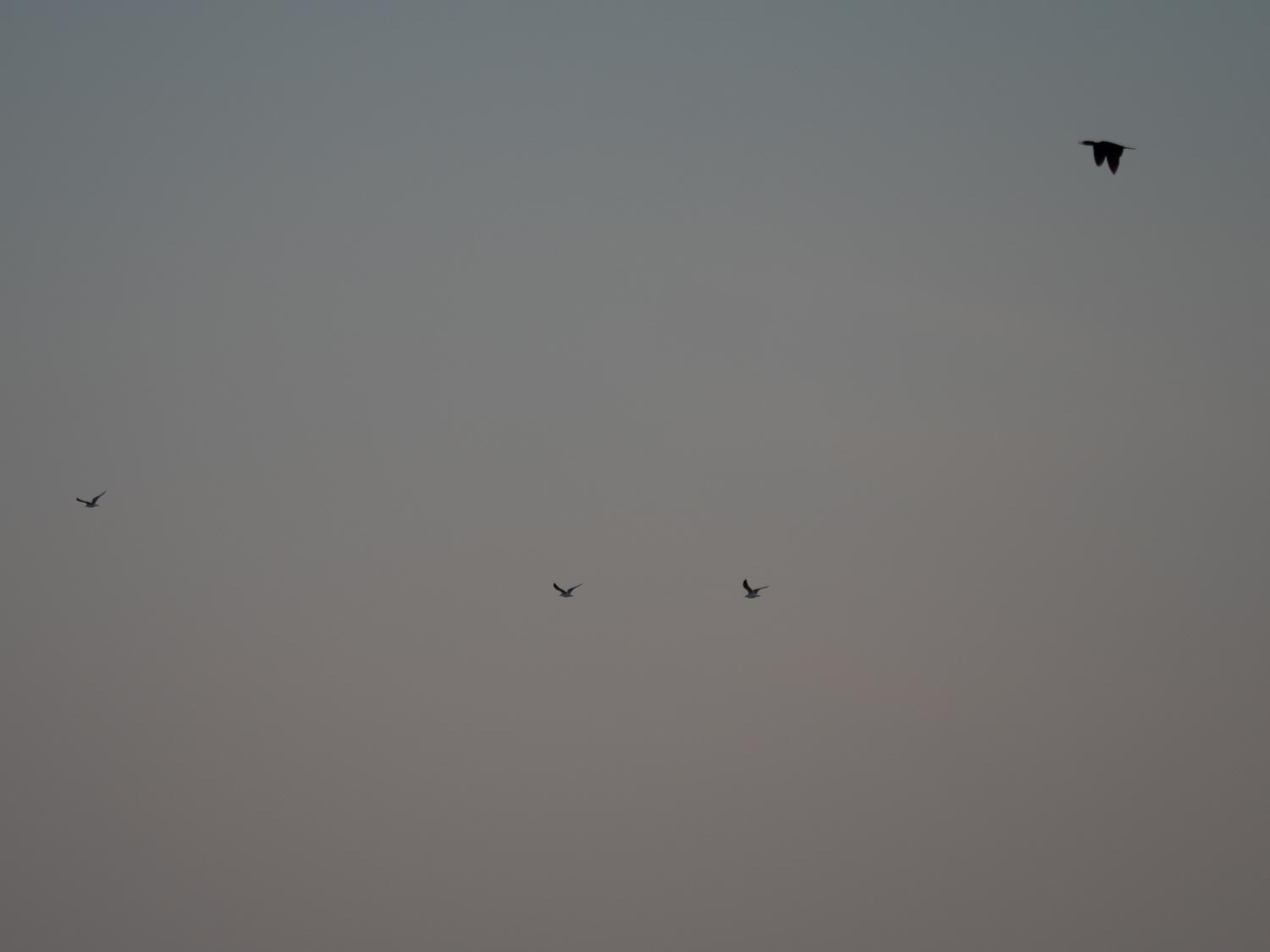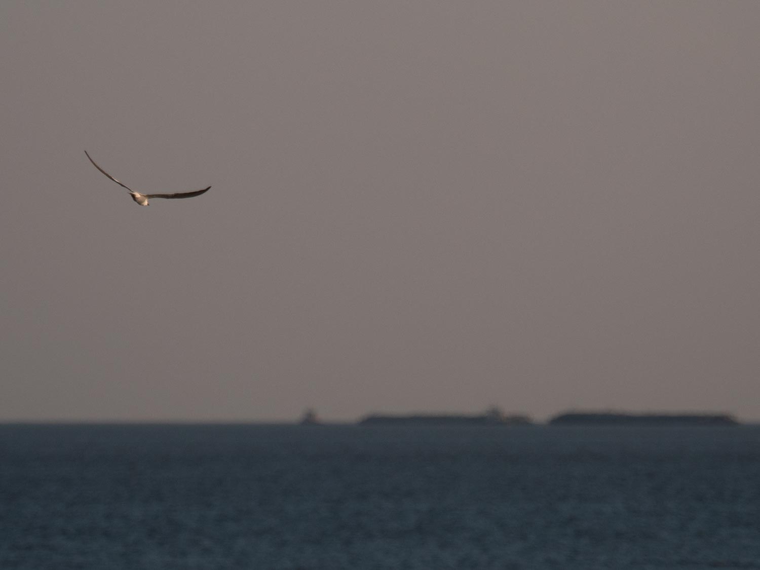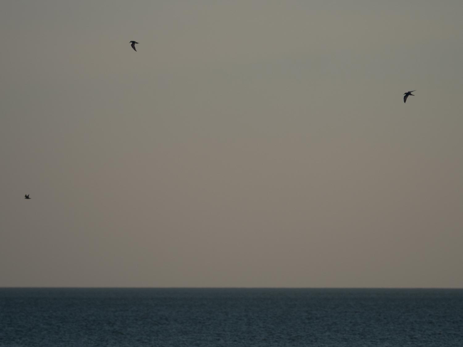 Birds skim low over the water.